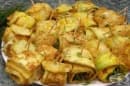 Гърдите нарежете на ивици и запечете леко от двете страни в сух тиган. Тиквичките настържете на едро (без да ги белите), към тях прибавете нарязания магданоз, подправките, намачкания чесън и разбъркайте. Лука нарежете на малки кубчета и задушете в олиото за кратко, докато стане прозрачен. Смесете сметаната, яйцата, настъргания кашкавал, щипка сол и заливката е готова.