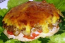 - Печено месо с гъби и яйчена заливка с топено сирене
