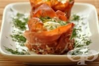Необходими продукти: 4-6 парчета бекон 2 яйца магданоз черен пипер сол Начин на приготвяне: Изпържет...